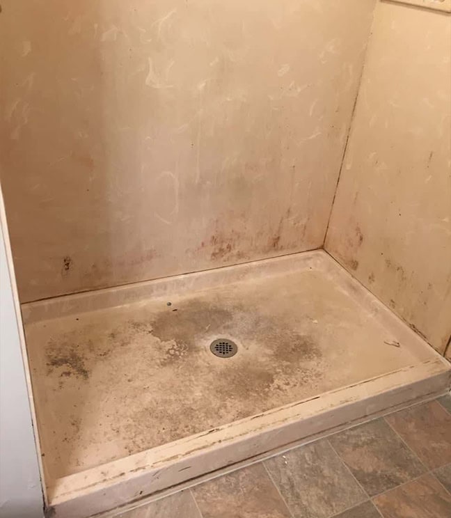 Extremely dirty and degraded shower unit in Lansing, IL. -Before refinishing