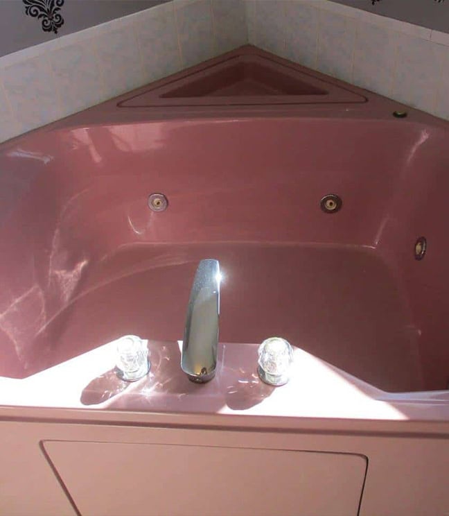 Powder pink whirlpool tub before refinishing in Burr Ridge, IL.