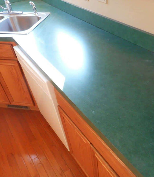 Outdated green kitchen tops before the reglazing process in Hoffman Estates, IL.