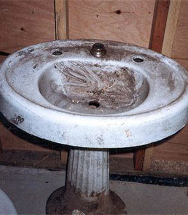 Heavily degraded porcelain sink before repair and refinishing in Joliet, IL.