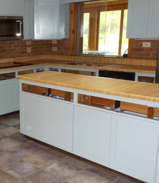 Butcher block style laminate kitchen tops after refinishing in one of our faux stone granite finishes in Palos Hills, IL.