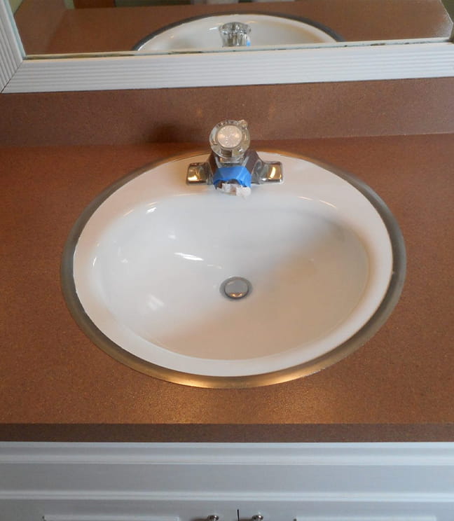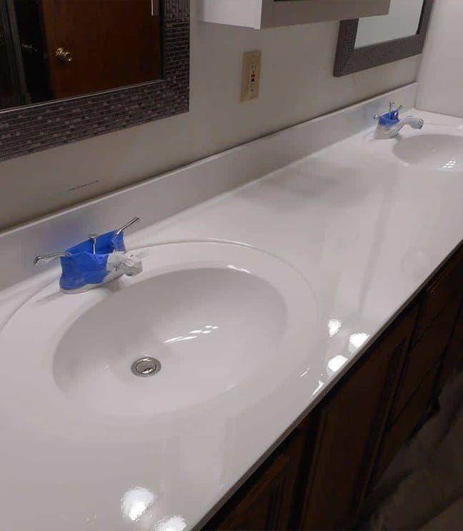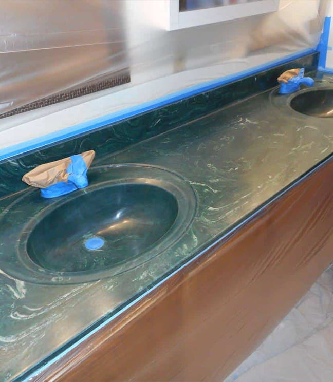 Bathroom Vanity countertops are refinished much in the same way as kitchen countertops. Our refinishing process allows our ECO-Safe Coatings to absorb and penetrate several types of vanity surfaces.